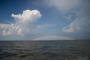 On our way to the islands, we rode through a rain storm that produced a water spout, then a rainbow. The biologists wondered if it might signal hope. Photo by Kim Hubbard/Audubon Magazine