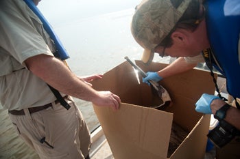 The pelican was placed in a box and transported to the oiled wildlife rehabilitation center in Fort Jackson, LA. Photo by Kim Hubbard/Audubon Magazine