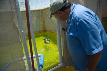 ![]() Jay Holcomb checks on a Gannett that is recuperating after being cleaned. Photo by Kim Hubbard/Audubon Magazine |