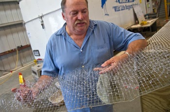 ![]() Jay Holcomb, director of the oiled wildlife rehabilitation center, shows a "noose carpet" used to capture oiled shorebirds. Photo by Kim Hubbard/Audubon Magazine |