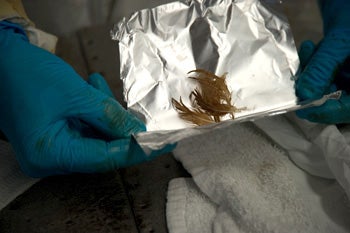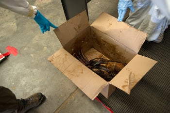 ![]() Sample feathers from oiled birds are kept as evidence. Photo by Kim Hubbard/Audubon Magazine |