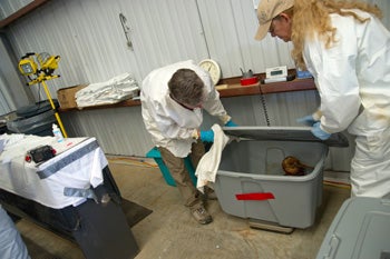 ![]() An oiled Gannett is weighed. Photo by Kim Hubbard/Audubon Magazine |