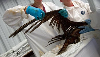 ![]() A oiled Gannett's wing is examined for damage. Photo by Kim Hubbard/Audubon Magazine |