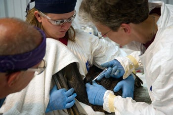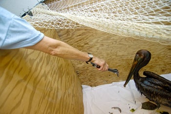 ![]() An oiled Brown Pelican has a fish hook and abscess removed from it's body. Photo by Kim Hubbard/Audubon Magazine |
