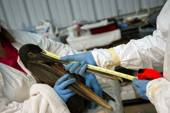 ![]() An oiled Brown Pelican is offered capelin, but the bird refuses to eat. Photo by Kim Hubbard/Audubon Magazine |