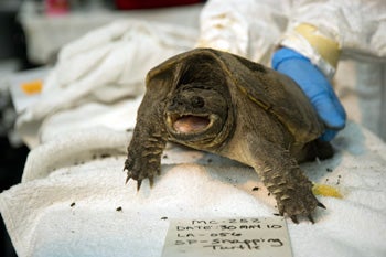 ![]() A Snapping turtle thought to be oiled. Photo by Kim Hubbard/Audubon Magazine |