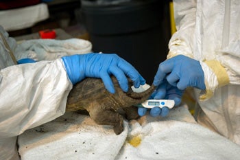![]() A Diamondback terrapin thought to be oiled. Photo by Kim Hubbard/Audubon Magazine |