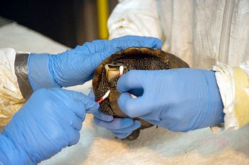 ![]() Measuring a pelican's bill helps determine its gender. Photo by Kim Hubbard/Audubon Magazine |