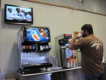 A worker watches President Obama speak as he takes lunch at a large truck stop cafeteria in Port Fourchon. (Photo by Justin Nobel/Audubon Magazine)