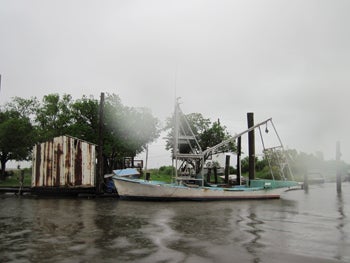 Louisiana Waterkeepers piled into a slipshod blue boat for a tour. Our skipper was a muscular man with sideburns named John Phillippe, Rosina’s nephew. As we motored slowly down Grand Bayou, the town’s main street, a procession of small homes came into view, clapboard houses with sunken roofs and split siding, the still undemolished victims of Hurricane Katrina. But the following row of homes was intact and tidy, with floating docks as front yards and backyards of marsh. There were barbeque grills and American flags.