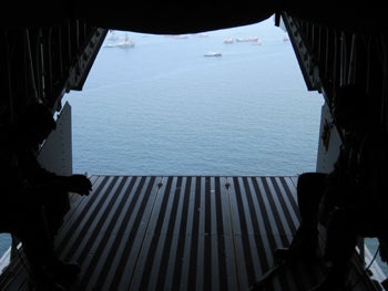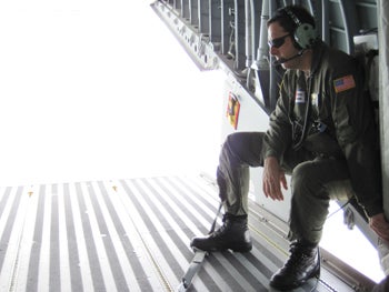 We are briefed by U.S. Coast Guardsman Stephen Perusin then stick squishy yellow plugs in our ears and cross the tarmac to the plane, a huge empty metal tube. Thin benches line the side and we sit. The HC-144 is a modified version of a military aircraft originally developed in Spain and Indonesia. It is meant to haul bulky cargo, enforce maritime law, track icebergs and execute search and rescues. In the Gulf the planes have been used to spot oil and escort media. “This is like my 26th time going out to the spill site,” says Perusin.