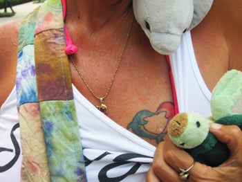 Cyndie Lepori, a "dolphin communicator" based in Florida, has two dolphin tattoos, one on her ankle and the other on her chest. "I'm not too fond of humans right now," said Lepori. (Photo by Justin Nobel/Audubon Magazine)