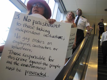 After confronting BP officials at the command center, the protesters were escorted out of the building by a security guard. (Photo by Justin Nobel/Audubon Magazine)