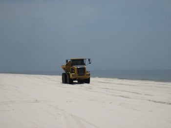A dump truck hauls oiled sand from a snow white beach on Bon Secour National Wildlife Refuge, in Alabama. "If you keep hauling sand off the beach, you're going to get a cliff too sharp for sea turtles to come up," says refuge spokesperson Jim Burkhart. (Photo by Justin Nobel/Audubon Magazine)