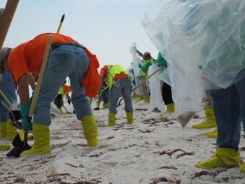 I pass a Hooters, the only crowded restaurant and enter Florida. At Perdido Key State Park, I pull into a sandy parking lot. On the other side of the dunes, the water is turquoise, like advertised on the billboard back in Alabama. Only now, the beach is littered with a thin ribbon of turd-like brown pellets, tar balls. Under a dark sky brimming with afternoon storms is gathered a group of nearly one-hundred cleanup workers. "It's not a hard job guys, you can do this," says a sun-tanned man in a straw hat who is giving a sort of oil cleaning pep talk. "Remember, we're here for the money, we're here for the beaches."