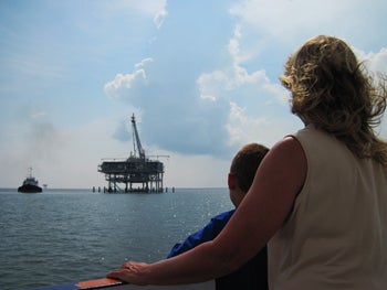 Donna Hodge and her grandson Hayden examine one of the many oil platforms in Mobile Bay, Alabama. "Two, three, four, five, twelve," counts Hayden. "There are like 1,000 of them." Donna recently lost her job at a crab shop because of the spill. (Photo by Justin Nobel/Audubon Magazine)