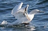 Lucky, a young male gannet, was found April 27 in the Gulf near the source of the leak. The Tri-State Bird Rescue team found that he was about 80 percent oiled, giving him an orange appearance. He was thin and dehydrated, so he was given intravenous fluids several times, as well as oral fluids and Pepto-Bismol for oil he may have ingested. He was washed with a mild detergent solution on May 1, and has been in an outdoor pool for a few days now, gaining weight.