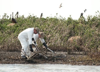 Lousiana Department of Wildlife and Fisheries biologists untangle an oiled pelican from fishing wire and take it to be cleaned. Photo by Kim Hubbard/Audubon magazine.