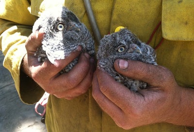 Last month, firefighters were fighting yet another forest fire in California. As they were building a control line in the Sierra National Forest, the U.S. Forest Service reports, the firefighters cut down a tree that happened to contain two young Western screech owls. One of the firefighters, Nick Gauthier (he’s the one holding the owlets in the photo above) quickly scooped them up and kept them out of harm’s way. Anae Otto, the biologist for that region of the forest, was summoned. “My heart was racing when I received the report of owls on the ground,” Otto told the Forest Service. “I was relieved to find the owlets alive and in fair condition.”