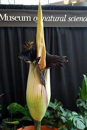 Usually when flowers bloom, you want to lean in and breathe deep to inhale the floral scent. Not so much with Amorphophallus titanum, more commonly called the corpse flower for the stench of decay it gives off. These Sumatran plants have a single leaf that can spread six feet across and a phallic flower structure that can top out at 10 feet high. Oh, and they might not bloom for a decade or so; when they do bloom, they unwrap a magnificent purple leaf over three or four days, and then the whole thing wilts like a hot air balloon that’s lost heat.