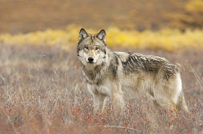 Preserving Arctic lands will also help the survival of species that are endangered in the lower 48 states but enjoy healthy populations in the Arctic, such as this majestic gray wolf photographed in Denali National Park south of the Arctic among the fall colors of the tundra. Denali National Park, Alaska. ©Florian Schulz / visionsofthewild.com