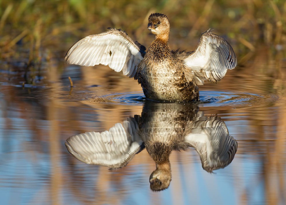 Picture a Pied-billed Grebe, dressed in brown, about a foot long, floating like a cork among lily pads. Suddenly the grebe begins to sink, inch by inch, like a submarine—until it disappears! Thirty seconds later, it reappears, just its head above the water, peering left and right.
