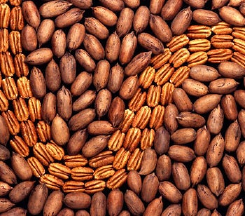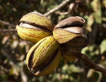 They were impressive trees indeed. A 300-year-old pecan might stand 200 feet tall with a straight trunk 8 feet in diameter and produce up to 1,000 pounds of nuts per year. The fruits, clustered in groups of 3 to 6, are covered with thin husks that break into four sections to release the nuts in September or October. Unlike walnut, which is worth its weight in gold, pecan wood has relatively few uses. But it is no exaggeration to say that Carya illinoensis is one of the most valuable cultivated plants of North American origin. Wild pecans (and walnuts, too) still reach the marketplace. But most of the pecans we consume today come from thin-shelled varieties grown on plantations in the Southeast.