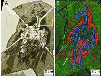 (Optical and false-colored photo of 120 million year old bird fossil. From "Trace Metals as Biomarkers for Eumelanin Pigment in the Fossil Record" by Wogelius et al. in Science Express)