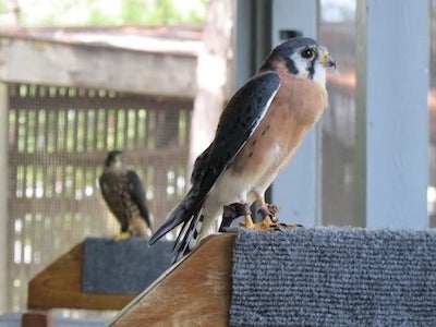 Newton, an American kestrel, enjoys a morning on the porch. Photo credit: Justine E. Hausheer