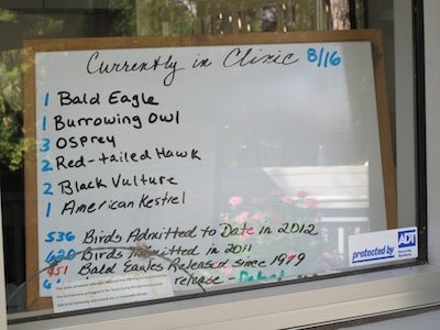 This patient signboard greets visitors to the center. The string of barbed wire in the corner was tangled in the wing of a patient. Photo credit: Justine E. Hausheer