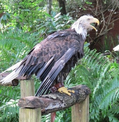 Eagle beaks and talons grow like human fingernails, explains Katie Warner, the program manager for the Maitland Center for Birds of Prey, where Trouble now lives. If he was left in the wild, his beak would have eventually hooked together and he would have starved to death.