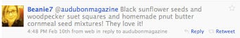 Audubon Magazine's readers respond to the question: What do you stock your feeder with in the winter months?