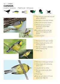 All of this (137 pages) before we ever get to the heart of the book -- the species accounts. The species accounts are unlike any others that I know of. They are incredibly rich in detail and profusely illustrated. Each account is headed with a few basic drawings showing the bird’s profile, a very effective schematic showing the plumage pattern, an undertail drawing, a range map, and a drawing showing the tree height at which one should expect to find the bird. This is followed by three panels listing and illustrating the major points of identification of a “typical” bird. Then the fun starts with distinctive views, additional photos (of living birds – most are perched, and some in the hands of banders) and photos of museum study skins showing subtleties of plumage variation. The species accounts also include photos of similar-appearing species and photos aimed at sorting through age and sex variations. And, of course, sonograms for songs, chips, and flight calls. Below are two plates from the species account of the Canada warbler: