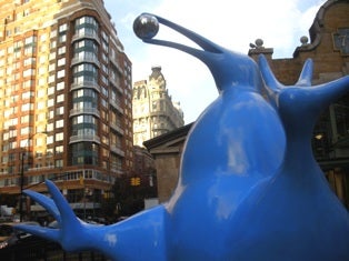 The round, rollicking creature is planted plumb in the middle of Broadway. Pinching a silvery treat in his beak, perhaps a fruit or seed, his feet are merrily aloft, as though he were rolling back in laughter at the startled pedestrians.
