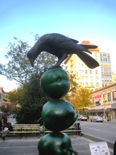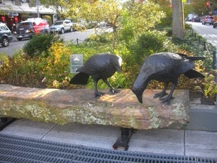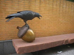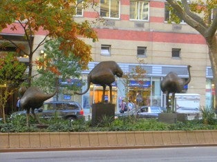 Ostriches, bantam hens, and a host of playful ravens, are among the Malls’ avian menagerie. Woytuk’s whimsical sculpture also depicts acorns and apples, rubenesque sheep, burly bulls, elephants, and a mysterious beast known as the “bearcat.”