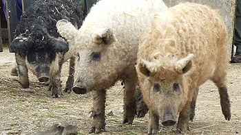 The curly-cued animals are, in fact, pigs covered in woolly hair and originate in