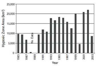 Changes in area of the hypoxic zone on the Louisiana continental shelf from 1985 through 2003, plotted on the basis of measurements made by N.N. Rabalais (Louisiana Universities Marine Consortium, written commun., 2005). Photo: U.S. Geological Survey