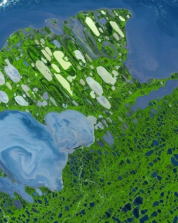 A satellite image of the 22-mile-long Teshekpuk Lake (lower left) and other tundra lakes below the Beaufort Sea (at top). Photo: NASA/GSFC/METI/ERSDAC/JAROS, and U.S./Japan ASTER Science Team, via Wikimedia Commons
