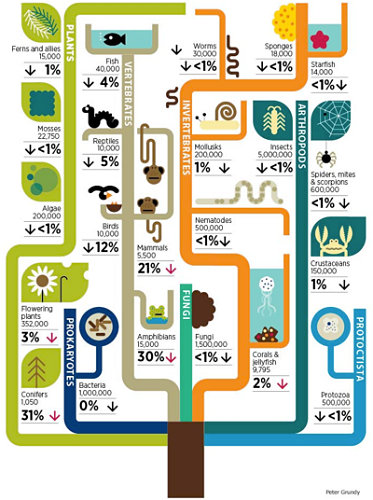 ![]() This tree shows how species are related, the estimated number in each group, and the percentage of those threatened. Illustration by Peter Grundy |