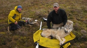 ![]() U.S. Fish and Wildlife Service biologist Dominique Watts (right) and Lem Butler, a biologist with the Alaska Department of Fish & Game, work together to capture, collar, sample and release Alaska Peninsula wolves. Photo by Dominique Watts/USFWS |