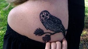 Molly Tsongas’ TogetherGreen project, Tatzoo, is finally making its mark—literally. This week, one of her participants went under the gun, inked for life with a beautiful black spotted owl.
