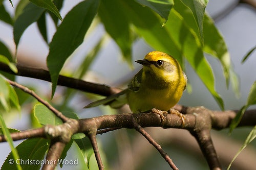 When a golden-winged warbler makes whoopee with a blue-winged warbler, the results aren’t always the same: you get a Brewster’s or a Lawrence’s warbler, depending on the genetic makeup. First discovered in the wild in 1874, Brewster’s warbler (below) exhibits genetically dominant traits, and Lawrence’s warbler (far below) exhibits genetically recessive traits. These two hybrids are relatively common and found throughout the eastern United States. There’s some controversy surrounding their parents, which are so closely related that scientists have debated whether they should be considered one species or two. Brewster’s and Lawrence’s warblers successfully mate with blue-winged or golden-winged warblers (producing birds that are clearly hybrids and birds that are indistinguishable from either pure species), but rarely with other hybrids.