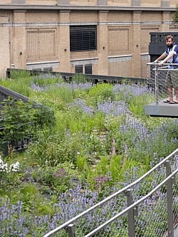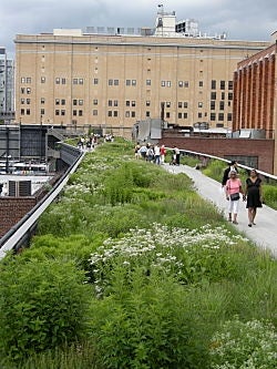 I finally gave in and went the new High Line park along Manhattan’s west side. Tucked among steel, glass and brick buildings, the old elevated train line is now home to lush gardens full with 210 species of wildflowers, meadow grasses, and trees. Hundreds of people ate lunches along the benches lining the path, despite the low-hanging rain clouds and thick humidity. Children strolled alongside their parents, stopping to examine each new flash of color in the dense vegetation. Birds darted from beneath branches of young trees. Views from the lofted corridor ranged from decrepit warehouses and Hudson River piers to trendy Meatpacking District restaurants and cavernous walkways through buildings. It is a sanctuary 30 feet in the air; a natural landscape nestled within an urban community and a green alternative for residents, workers, and visitors who want to avoid traffic congestion and vehicle exhaust on Tenth Avenue.