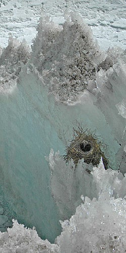 The discovery, reported in the current issue of the Wilson Journal of Ornithology, was made by University of Massachusetts Amherst geoscientist Douglas Hardy with help from his 14-year-old son Spencer, an enthusiastic bird student who identified the species from photographs. The senior Hardy has been monitoring climate change on the Quelccaya Ice Cap, high above Cuzco, for several years and had found a number of diuca-finch nests that appeared to have fallen off the ice face as it melted. Then this past austral winter he located intact nests on the ice and one of them contained abandoned eggs.