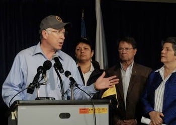 Interior Secretary Ken Salazar, EPA Administrator Lisa Jackson, Louisiana Congressman Charlie Melancon, and Department of Homeland Security Secretary Janet Napolitano. Photograph courtesy of MMS.