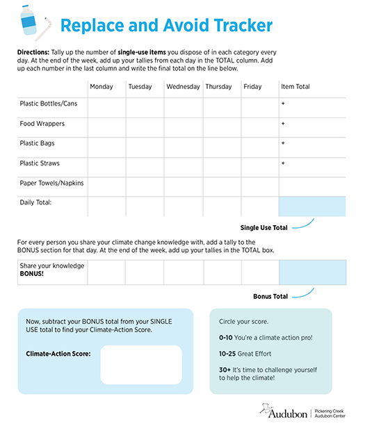 How much plastic can you eliminate from your life? Find out with the Replace and Avoid Challenge. Use the Replace and Avoid Tracker worksheet. Print off the PDF or, if you don't have a printer, copy the design and draw your own chart on a piece of paper. For an entire week, tally up how many plastic items your household goes through. You can also count your paper towels and cans, since the process of creating those items releases carbon pollution, too. Once you know how much you're using, you can find ways to reduce your plastic use so you help birds and help prevent climate change.