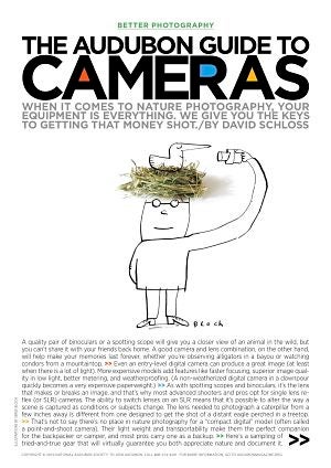 “A quality pair of binoculars or a spotting scope will give you a closer view of an animal in the wild, but you can’t share it with your friends back home,” writes David Schloss in the Nov-Dec Audubon. “A good camera and lens combination, on the other hand, will help make your memories last forever, whether you’re observing alligators in a bayou or watching condors from a mountaintop.”