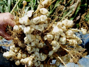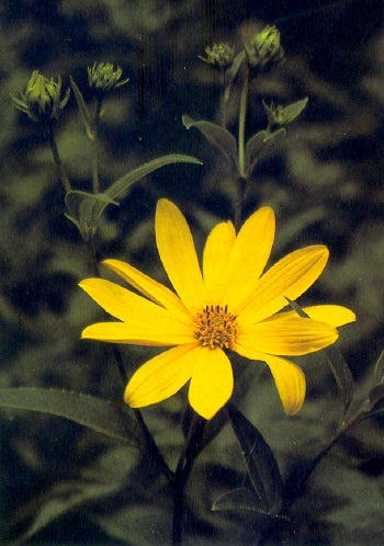 Jerusalem artichoke (Helianthus tuberosus), which stands as tall as 10 feet with golden-yellow flower heads that measure up to 3 inches across, flourishes from August into October in damp places east of the Rockies. But its original range is something of a mystery. Native Americans were harvesting its small potato-like tubers from their gardens when the French explorer Samuel de Champlain arrived at Cape Cod in 1605 and they probably traded the plant far and wide. Champlain sent samples home, commenting that they tasted like artichokes, and within a few years the plant was being cultivated throughout Europe. Italians called it girasole, which means "turning to the sun" and was quickly corrupted to "Jerusalem." By 1620 the Oxford English Dictionary had an entry for "Artichokes of Jerusalem."