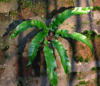 Thus, as a U.S. Forest Service web page enthuses, "Hart's-tongue fern is a rare treat for the eyes; it is so green, glossy and large that it defiies reality. The elegant, smooth, unserrated fronds are 8 to 16 inches in length and look decidedly tropical and incongruous in the northern forest they inhabit." The U.S. Fish and Wildlife Service, meanwhile, relates that quarrying, and logging along with residential and ski-resort development have all but destroyed these plants and their habitat. In short, if you are fortunate enough to find a hart's-tongue fern in the wild, admire and photograph it but don't collect it. I hasten to add that my plant came from a nursery.