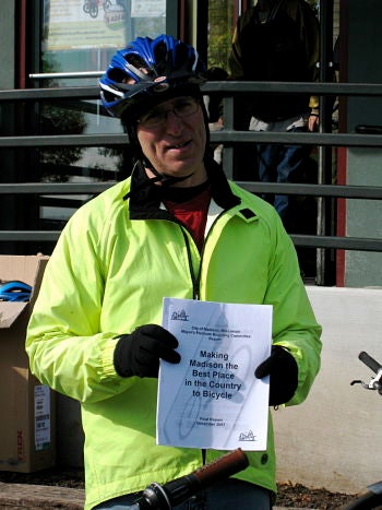 I purchased some warm bike gloves—we met our tour guide, Mark Clear, a city alderman and avid bike-commuter. He has taken on the mission of maximizing the bike-friendliness of Madison, and showed us the city council's "Making Madison the Best Place in the Country to Bicycle" report drafted in 2007.